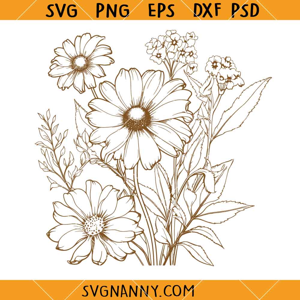 Product Tags# Retro outline wildflower bouquet SVG, Wildflower Bouquet Outline SVG, Wildflower SVG, Floral Svg