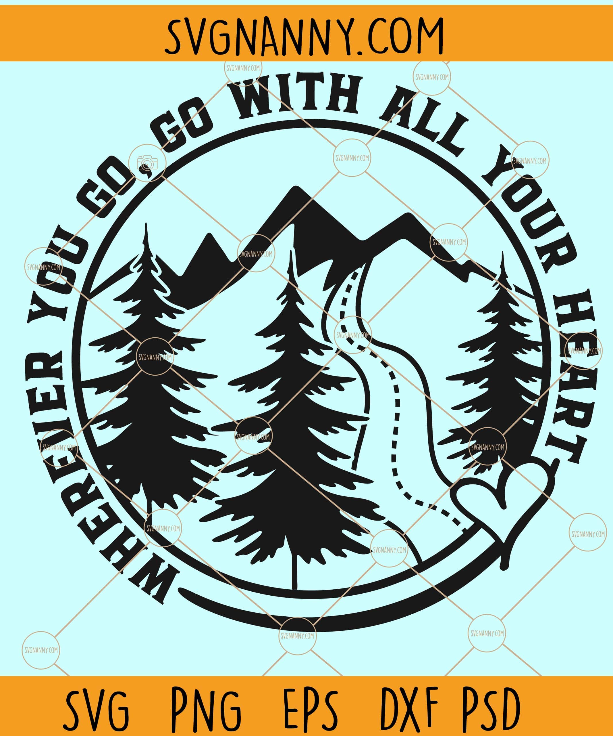 Product Tags# Wherever you go go with all of your heart svg, mountains and trees svg, camping scene svg, camping svg, inspirational quote svg, motivational svg, camping quote svg